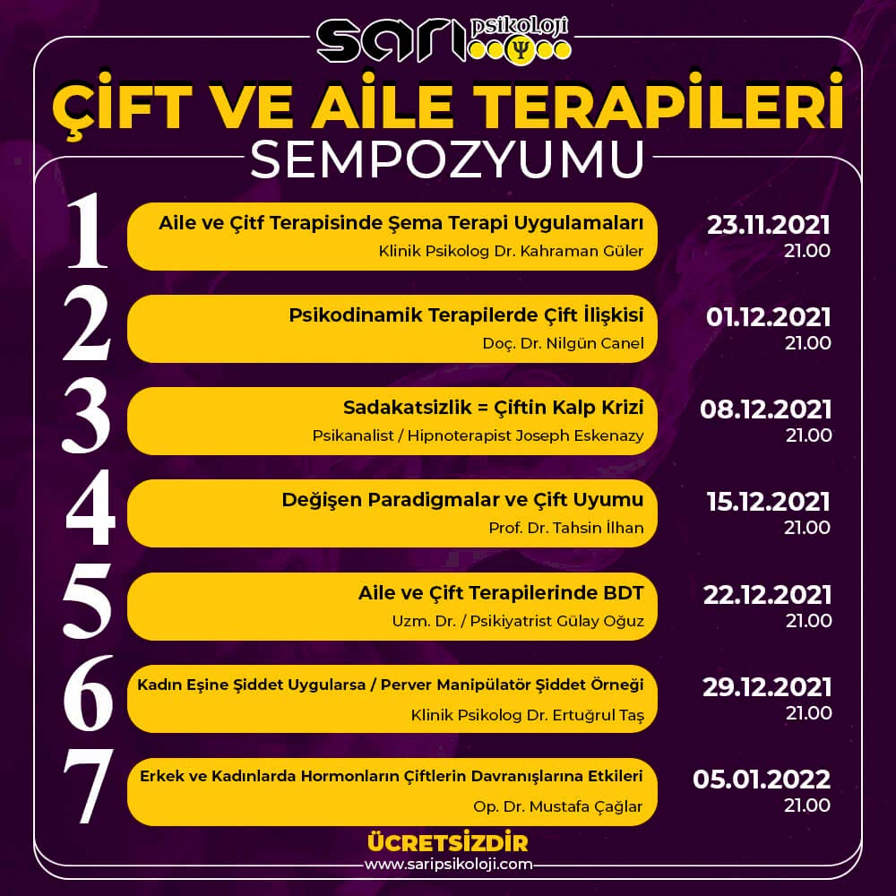 Aile ve Çift Danışmanlığı Sempozyumu katılımı ücretsizdir. Katılım sağlamak için Sarı Psikoloji ''Sarı Güncel Programlar'' whatsapp gruplarından birinde olmanız yeterlidir.